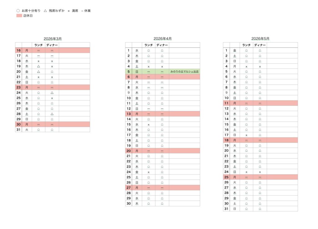 - アラカルトの事前のご予約は火、水、木曜日のみとなります。金、土、日曜日は当日お電話にてご確認の上ご予約お願いします。