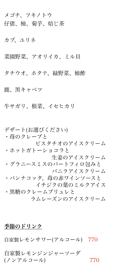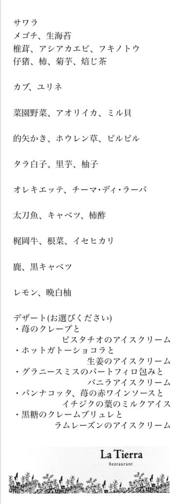 投稿日: 2025年7月16日2026年1月31日2026冬のメニュー 最近のメニューの一例となります。季節の移ろいや天候などによって仕入状況は刻々と変わっていきますのでご参考までとなります。お苦手や気になるメニューがあればご相談ください。 ランチメニュー例 ディナーコースA Menu de La Tierra