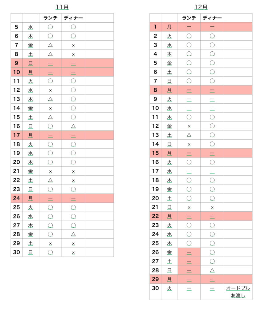 - 来店時間は11:30、またはお席が空き次第となります。
