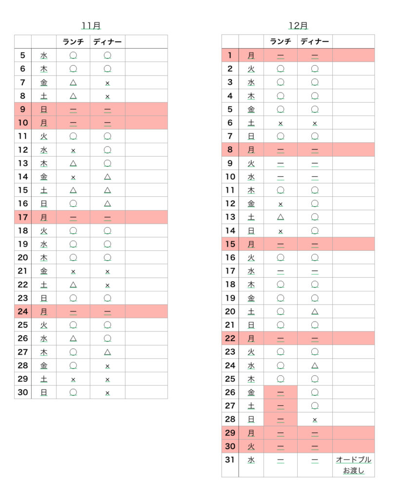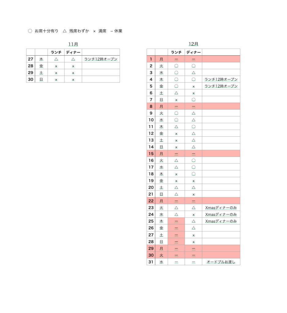 - 来店時間は11:30、またはお席が空き次第となります。