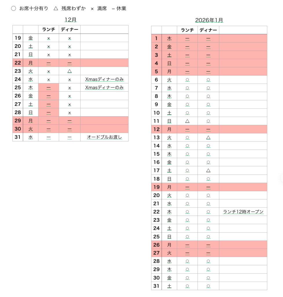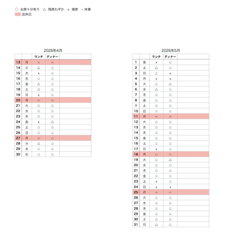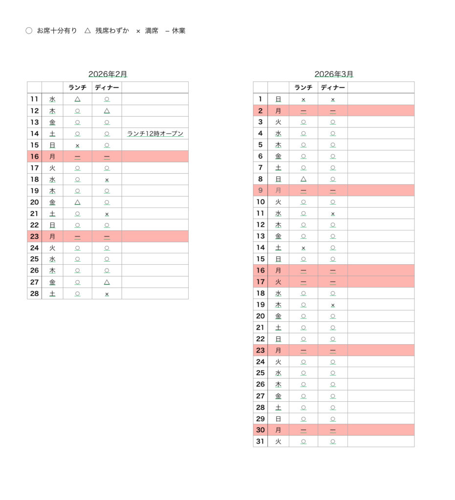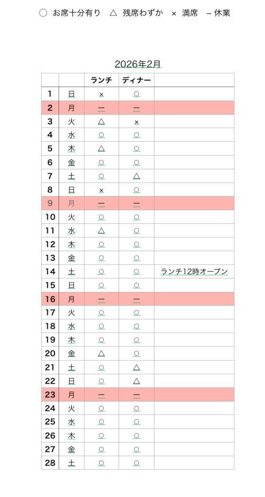 - アラカルトの事前のご予約は火、水、木曜日のみとなります。金、土、日曜日は当日お電話にてご確認の上ご予約お願いします。