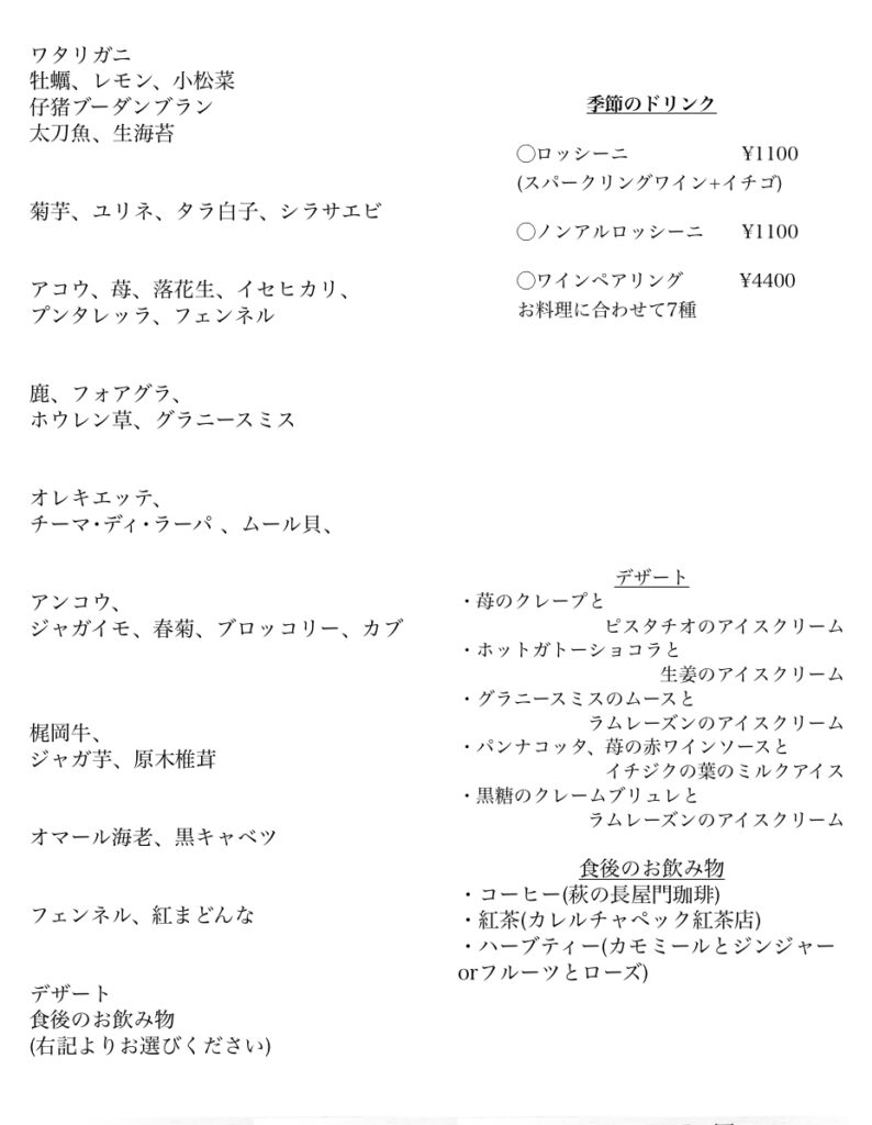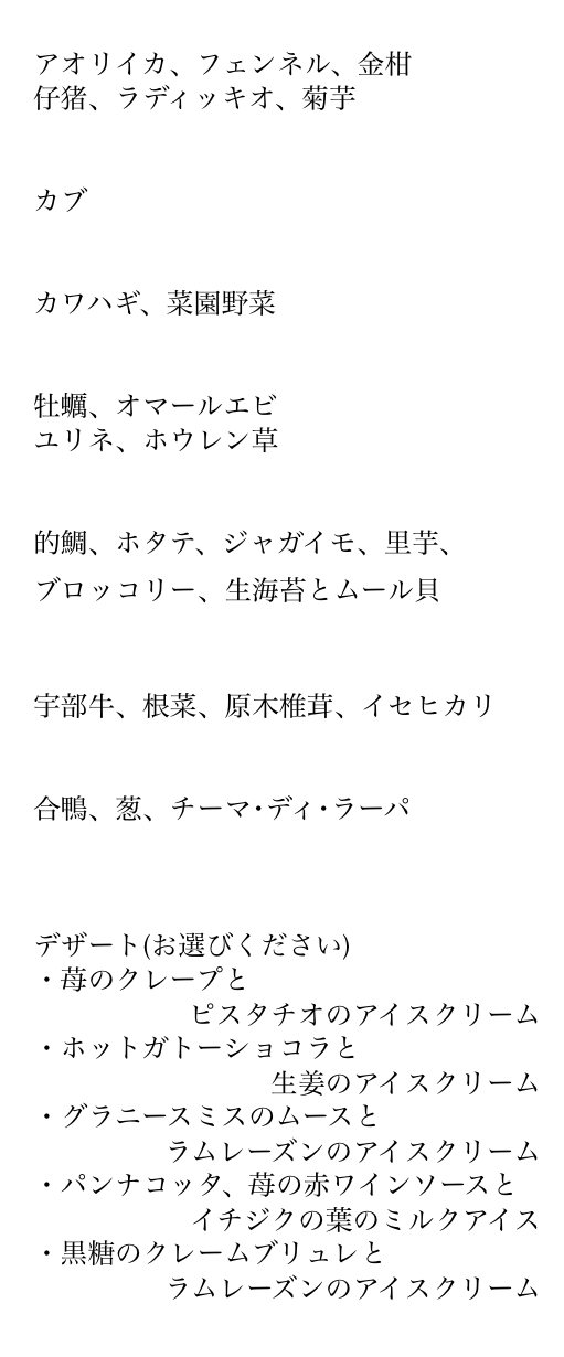 投稿日: 2025年7月16日2026年1月9日 投稿者: Takashi Takahashi2026冬のメニュー 最近のメニューの一例となります。季節の移ろいや天候などによって仕入状況は刻々と変わっていきますのでご参考までとなります。お苦手や気になるメニューがあればご相談ください。 ランチメニュー例 ディナーコースB Menu de La Tierra