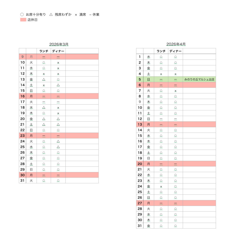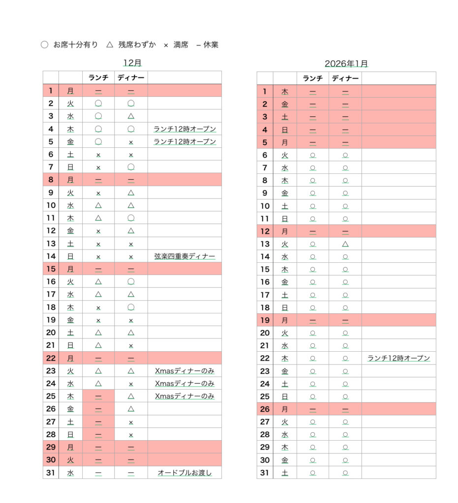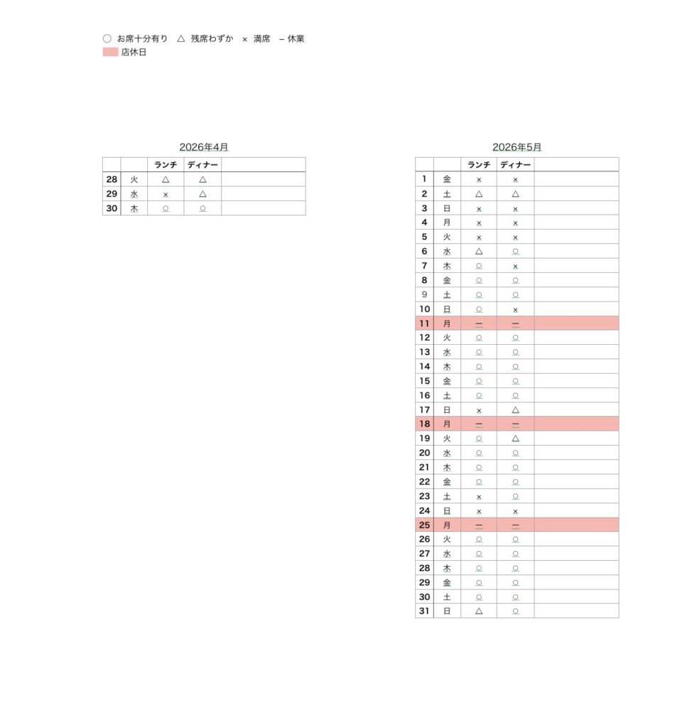 - アラカルトの事前のご予約は火、水、木曜日のみとなります。金、土、日曜日は当日お電話にてご確認の上ご予約お願いします。