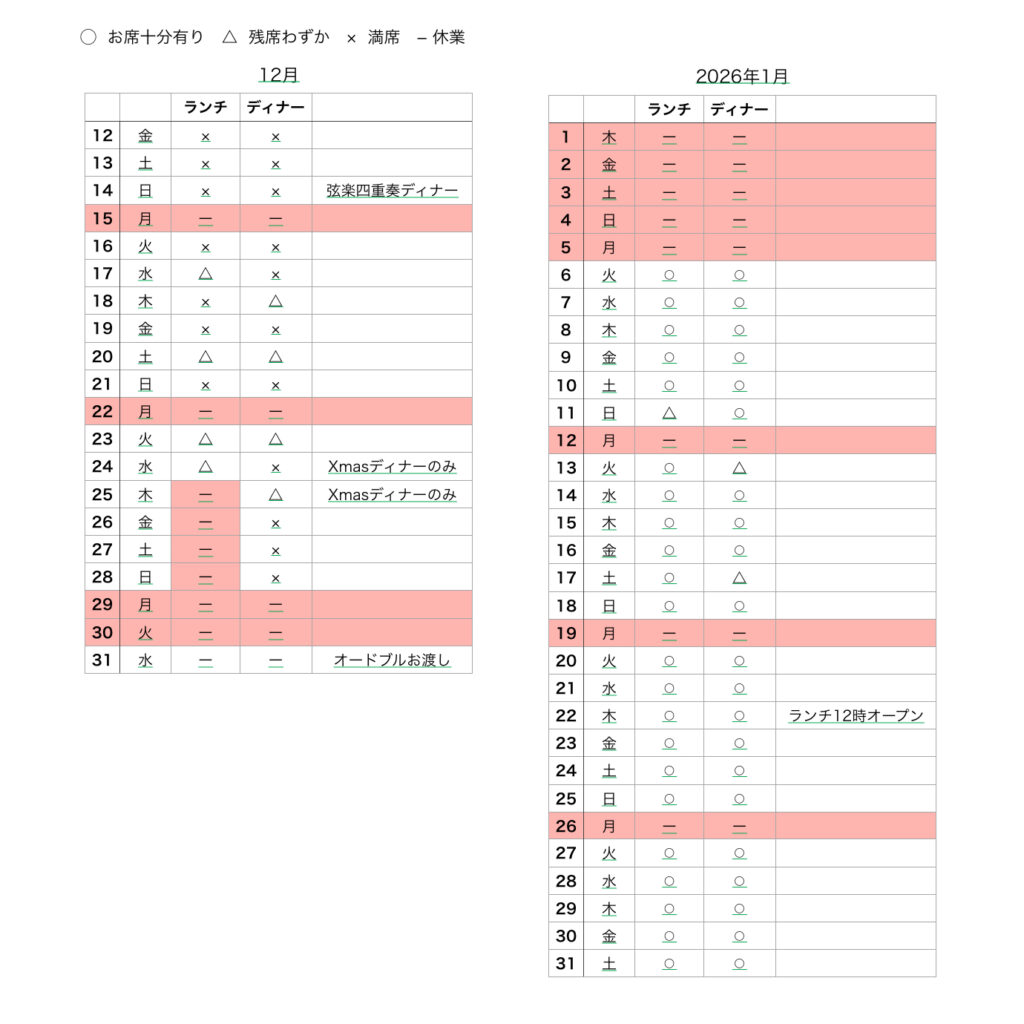 - アラカルトの事前のご予約は火、水、木曜日のみとなります。金、土、日曜日は当日お電話にてご確認の上ご予約お願いします。