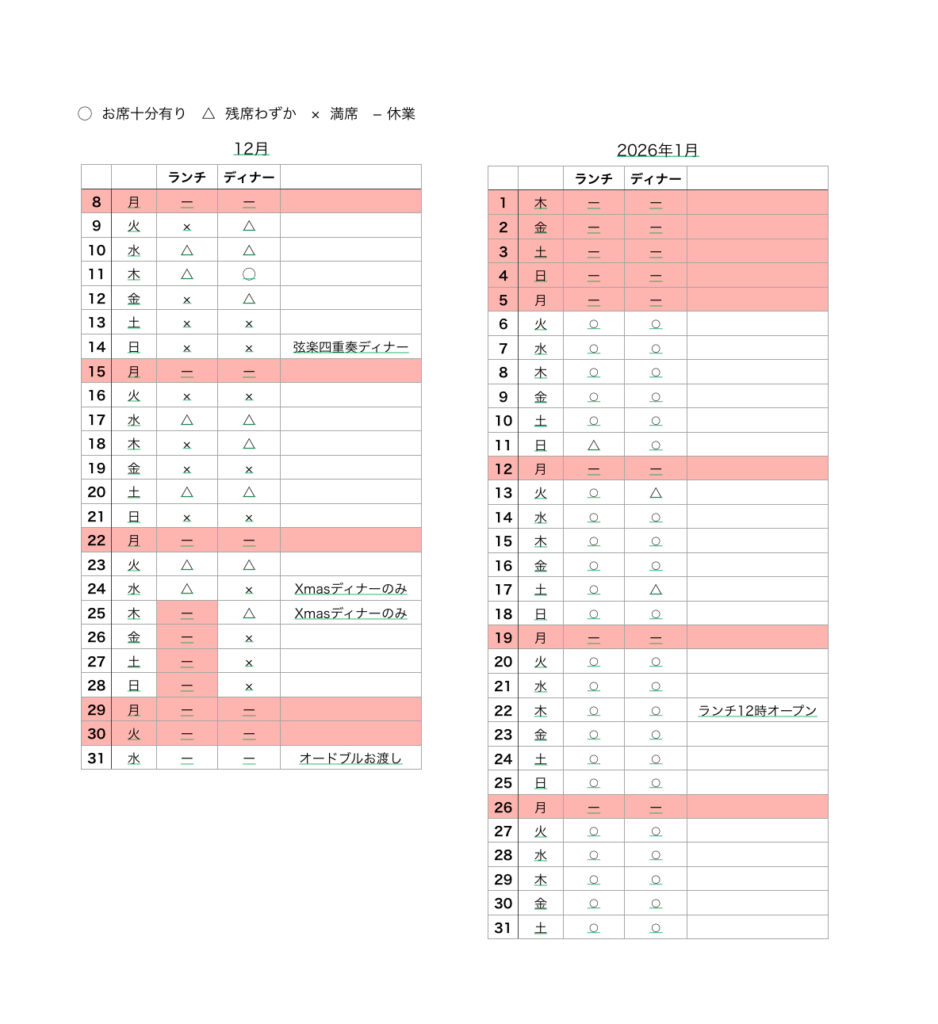 - アラカルトの事前のご予約は火、水、木曜日のみとなります。金、土、日曜日は当日お電話にてご確認の上ご予約お願いします。